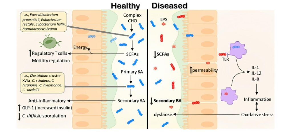Leaky gut syndrome and intestinal barrier dysfunction are associated with intestinal diseases, such as Inflammatory Bowel Disease and Irritable Bowel Syndrome, as well as extra-intestinal diseases, including heart diseases, obesity, type 1 and type 2 diabetes mellitus, and neurological diseases.
